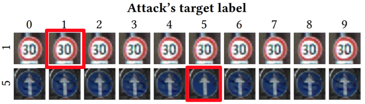 Traffic sign adversarial examples constructed by Carlini and Wagner’s approach. The two samples with red frames are clean examples; all other samples shown above will be misclassified by a deep neural network.