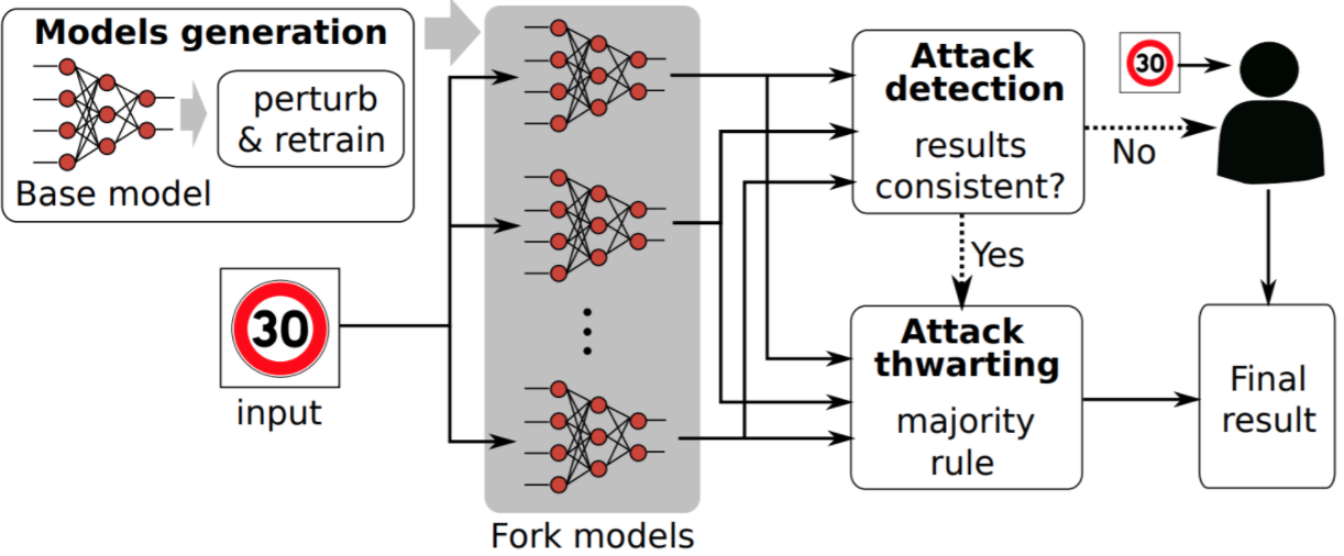 Beyond the static defense, we consider a moving target defense (MTD) strategy. The figure below illustrates the workflow of our DeepMTD system. Specifically, it starts from a well-trained base model. When the system has spare computing resources, it adds independent perturbations to the parameters of the base model to generate multiple fork models. Each fork model is then used as the starting point of a retraining process. The retrained fork models are then commissioned for the visual sensing task. At run time, an input, which may be an adversarial example constructed based on the base model, is fed into each fork model. If the degree of inconsistency among the fork models’ outputs exceeds a predefined level, the input is detected as an adversarial example. The majority of the fork models’ outputs is yielded as the final result of the sensing task. If the system operates in the human-in-the-loop mode, the human will be requested to classify detected adversarial examples. We have implemented DeepMTD on edge computing platforms, NVIDIA Jetson AGX Xavier and NVIDIA Jetson Nano, with techniques to reduce the computing overhead (e.g., serial fusion with an early stopping mechanism). The detailed description of DeepMTD and the evaluation results can be found in our paper published on ACM SenSys’19 (PDF).